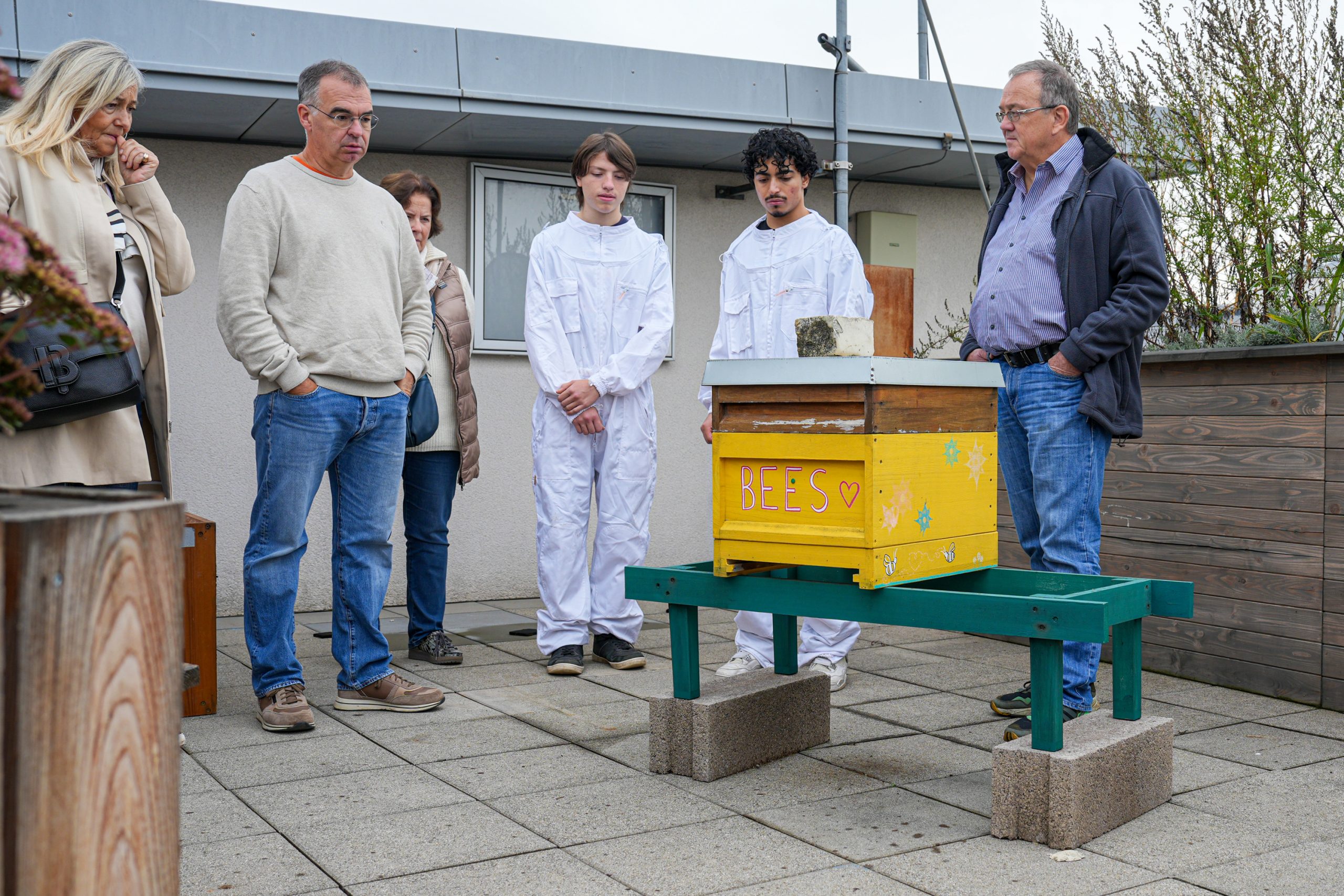 Dëse Projet gouf am Kader vu reNature1 vun der Œuvre Grande-Duchesse Charlotte realiséiert : op engem Daach vun eiser Schoul huet ee Schülergrupp fir d’Installatioun an d’Beplanzung vu grousse Blummebacke gesuergt, een anere Grupp huet d’Beiestäck opgeriicht a sech ëm d’Beien an den Hunneg gekëmmert.